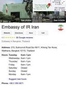 שעות קבלה בשגרירות בבנגקוק – בוקר ואחר צהריים. פחות שעות מהבריטים, ועדיין יש הזדמנות למי שגרים בפריפריה של תאילנד.