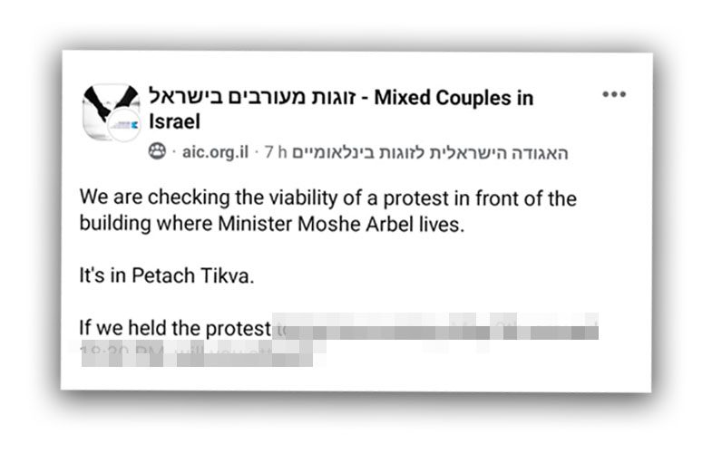 בקבוצת הפייסבוק “זוגות מעורבים” מועברים שאלונים לתיאום הפגנת מחאה מול ביתו של שר הפנים משה ארבל בפתח תקווה.