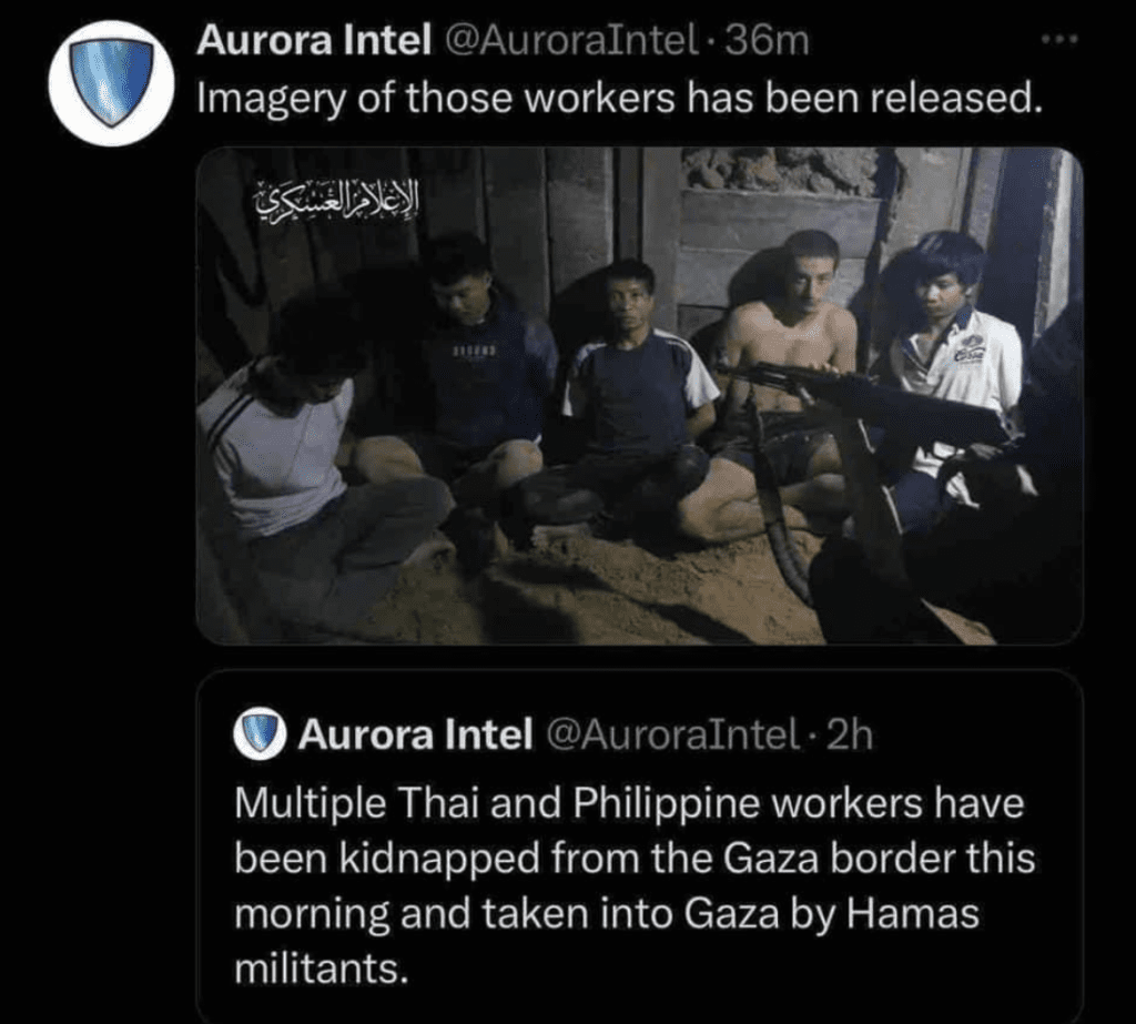 Clash Report on Twitter: “Thai and Philippine workers captured by Palestinian forces in southern Israel today are now in Gaza. pic.twitter.com/gVGmp7i7gt / Twitter”