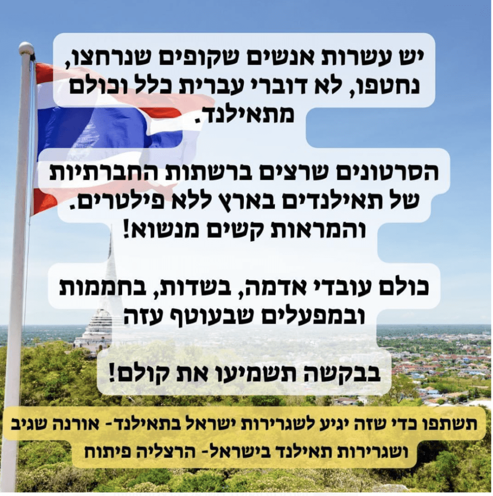 ההודעה באנגלית הופצה בקבוצות של עובדים פיליפינים ובקבוצות של עובדים תאילנדים, והגיעה גם למשפחות בתאילנד ובפיליפינים שיש להן בן משפחה בישראל.
