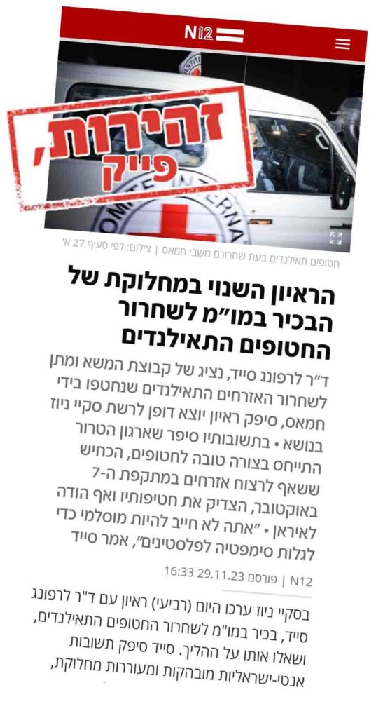אתר N12 של “חברת החדשות” (חדשות 12) פרסם כתבה שכותרתה: הראיון השנוי במחלוקת של הבכיר במו”מ לשחרור החטופים התאילנדים. על הכתבה לא חתום עיתונאי אלא “מערכת N12”.