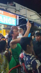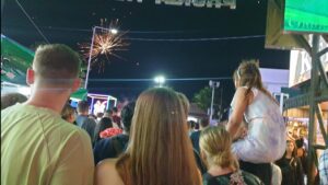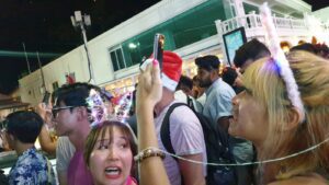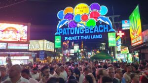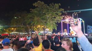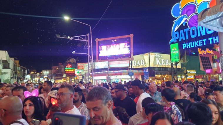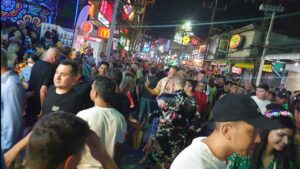אלפים צועדים על המדרחוב בפטונג לעבר החוף. זיקוקים ממלאים את האוויר, מתגברים בחצות.