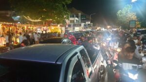 עומס רב ופקקים על כביש החוף. מכוניות המנסות לחצות נעצרות בין אלפים רבים של תיירים ומקומיים חוגגים