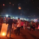 מנורות נייר עם נרות מועלות לאוויר על ידי חוגגים על החול.