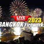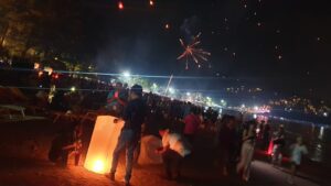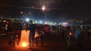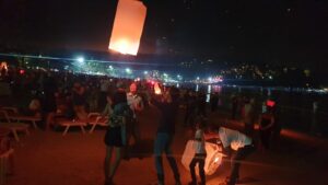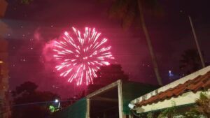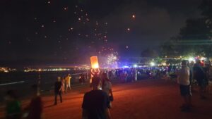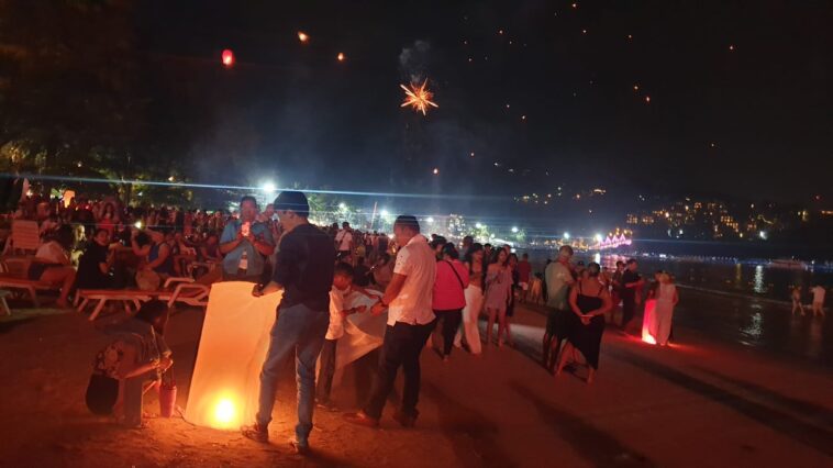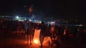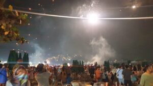 החופים עמוסים חוגגים. זיקוקים באוויר.