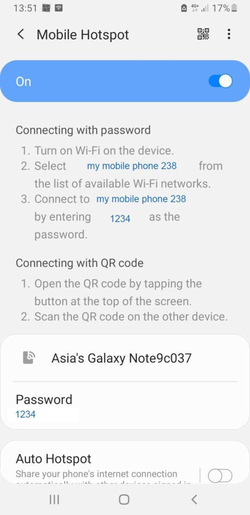 לוחצים על הכותרת Mobile Hot Spot וכך נכנסים לעמוד ההוט-ספוט בו מופיע שם הרשת המשודרת מהנייד, וסיסמת הכניסה (בעמוד זה ניתן גם לערוך ולשנות את שם הרשת והסיסמא).
