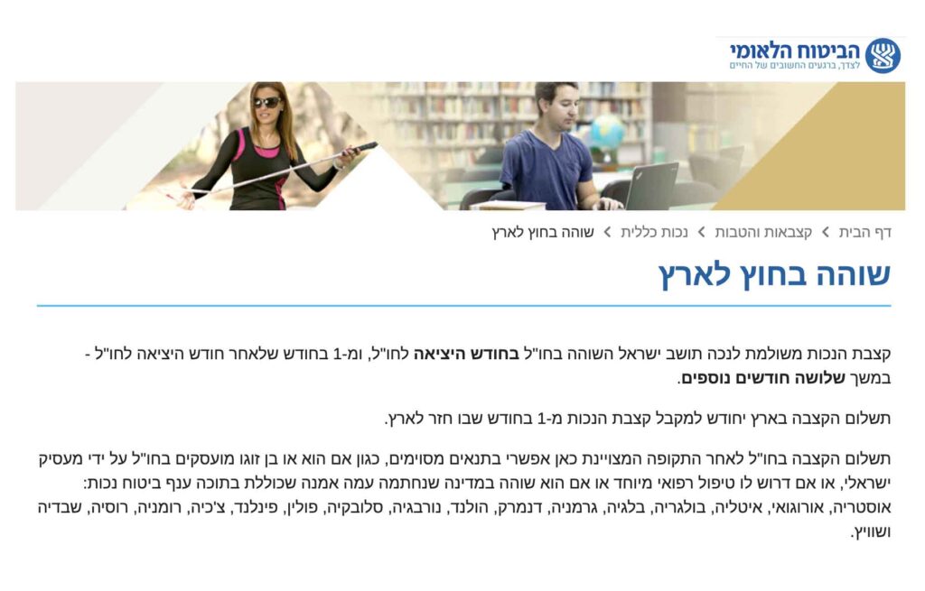 ביטוח לאומי מאפשר למקבל קיצבה, שלושה חודשי שהייה בחו”ל בהם ימשיך לקבל את הקיצבה/גימלה. אחר כך הקיצבה נפסקת.