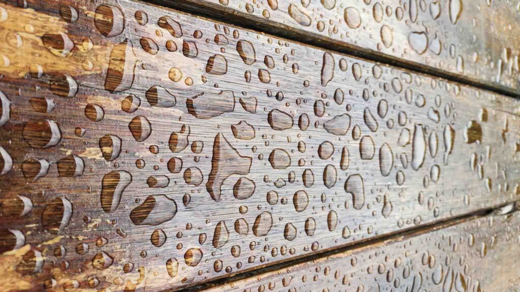 טיפות טריות, עדיין מעטרות את הפרקט, בבית שבתוך בג’ונגל