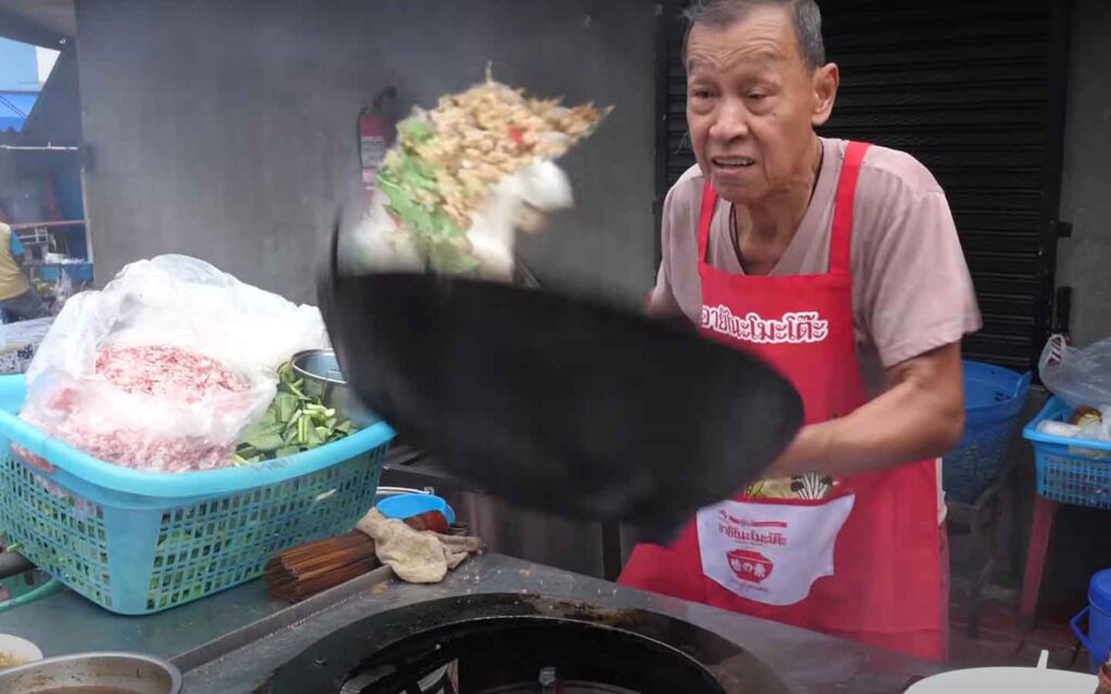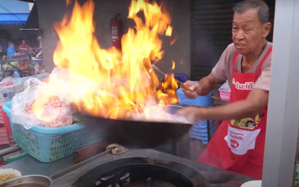ביצת עין תאילנדית, מטוגנת בדרך כלל בשמן עמוק , בווק, במטבח תאילנדי פתוח של מסעדה. נראה כמו מטבח שטח צבאי. ווק על תלת רגל ממתכת עם להבה מחוברת בצינור גומי לבלון גז.
