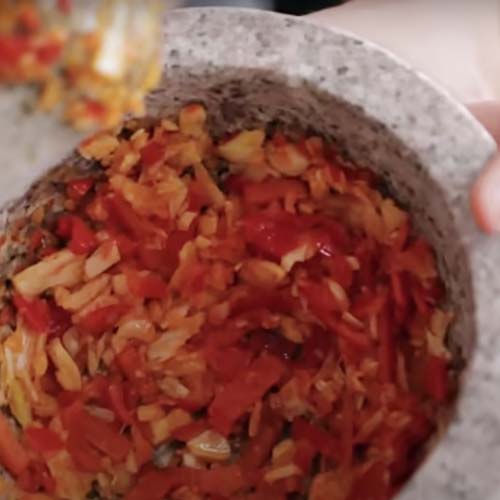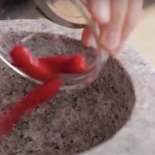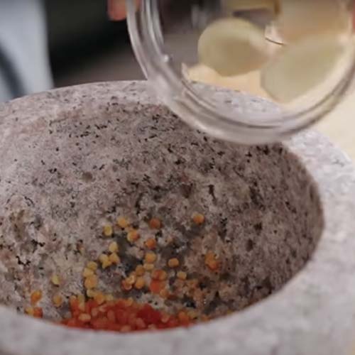 כותשת את הצ’ילי החתוך במכתש, או סתם חותכת קטן קטן. מוסיפה את שיני השום – חתוך קטן או חתוך במכתש, או מרוסק ב”כותש שום”, או במכות קראטה. כל אחד והסגנון שלו. בסוף נוצרת עיסה של פלפל צ’ילי טרי יחד עם שום – מעוכים וחתוכים יחד.