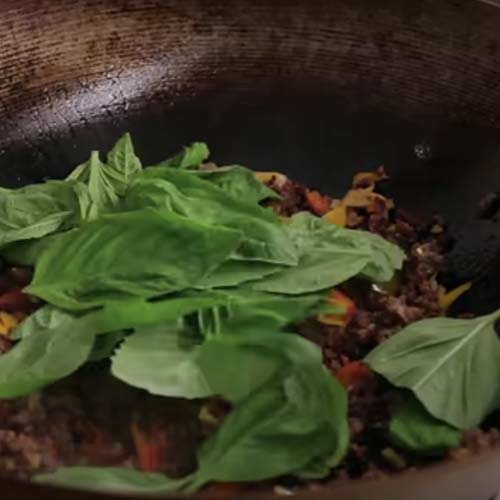 מוסיפים למחבת את עלי הבזיליקום הטריים, וממשיכים לטגן עוד קצת. עלי הבזיליקום העדינים יותר, מגיעים תמיד בסוף הטיגון. גם בטופו ועוף.