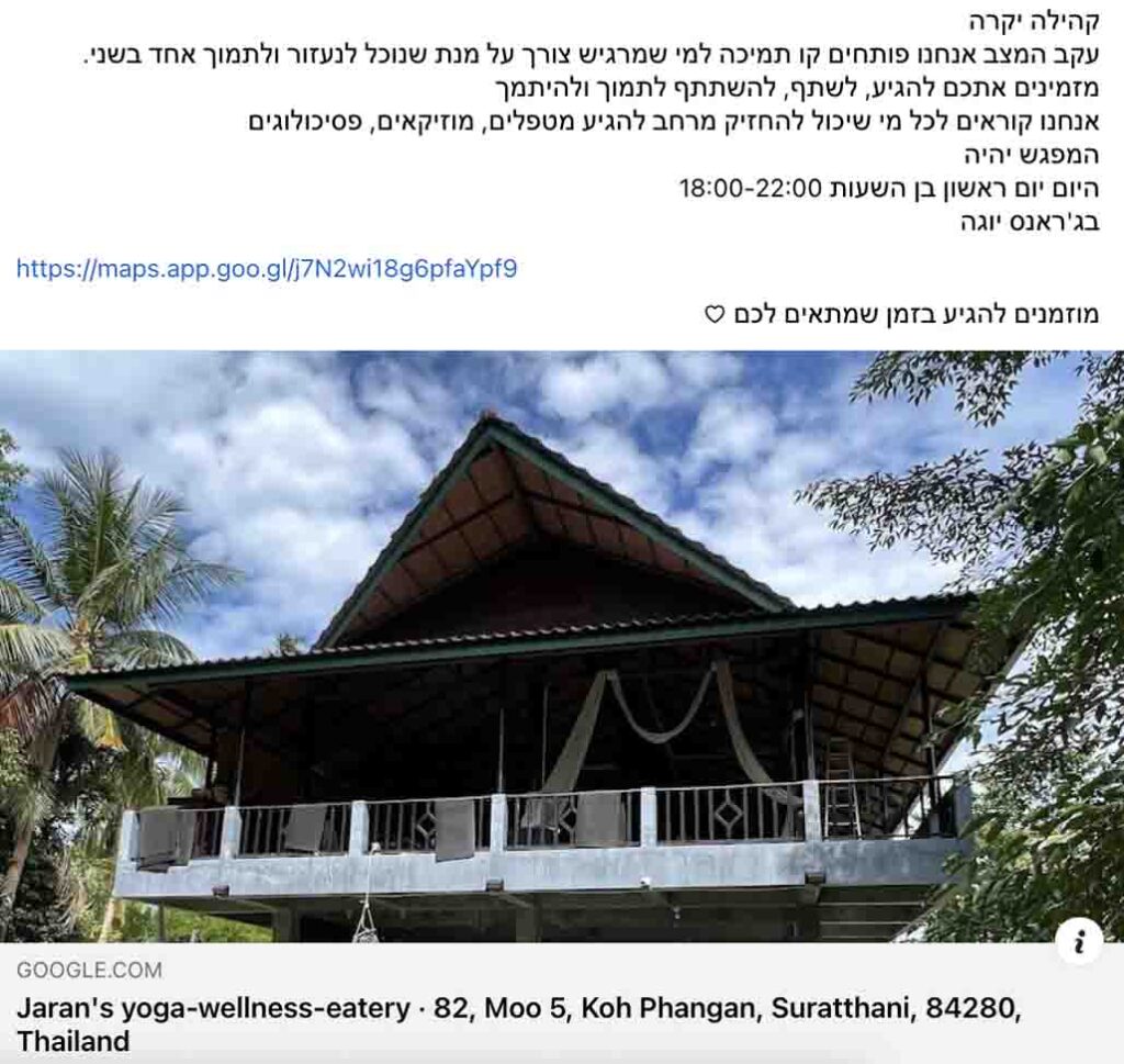 הודעה בקבוצת פייסבוק ” רילוקיישן קופנגן תאילנד”, מזמינה מוזיקאים מטפלים פסיכולוגים וקהל לקו תמיכה ומפגש לאור תקיפת חמאס את ישראל במהלך השבת שמיני עצרת.