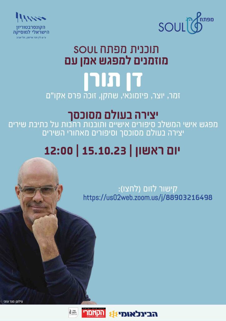 מפגש אישי המשלב סיפורים אישיים ותובנות רחבות על כתיבת שירים, יצירה בעולם מסוכסך, וסיפורים מאחורי השירים.