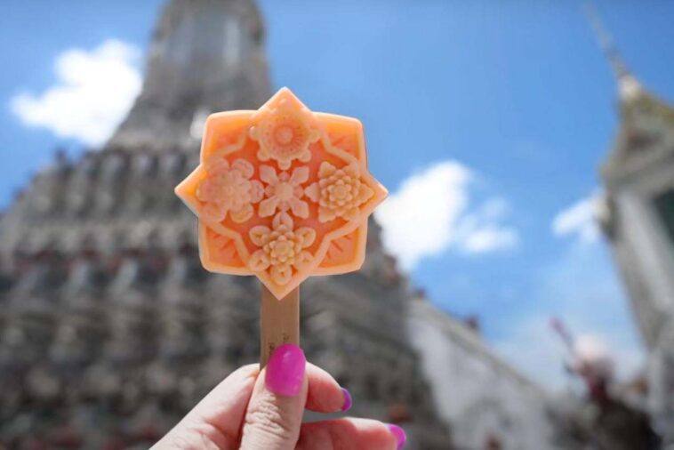 בכניסה למקדש השחר וָואט אָרוּן วัดอรุณ נמכרת גלידה צבעונית בארטיקים על מקל בצורת אריחי המקדש, המעוצבים כפרחים.